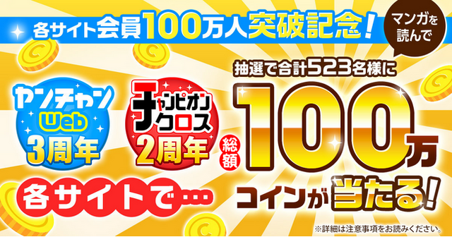 ヤンチャンWebとチャンピオンクロス、2つのサイトでそれぞれ100万コイン(合計200万コイン)山分けのビッグチャンス!