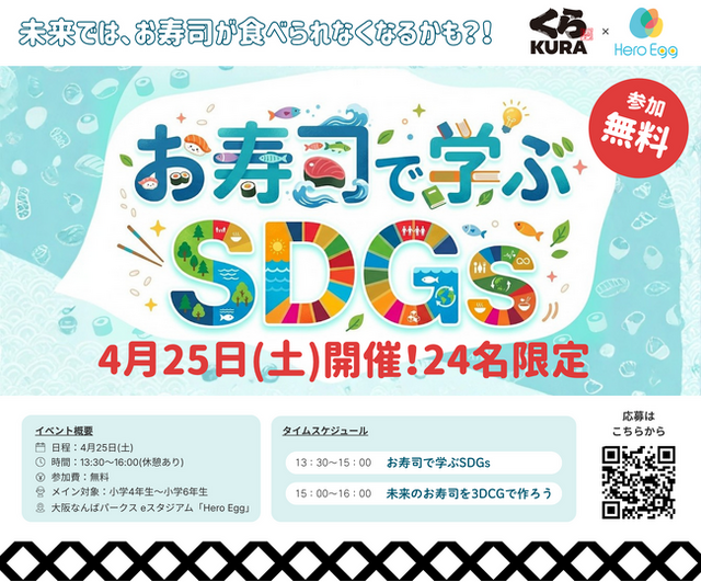 株式会社Meta Heroes(本社所在地:大阪府大阪市、代表取締役:松石和俊、以下「当社」)は、当社が運営するDX教育施設「Hero Egg(ヒーローエッグ)」において、回転寿司チェーン「くら寿司」を展開しているくら寿司株式会社(本社所在地:大阪府堺市、代表取締役社長:田中邦彦、以下「くら寿司」)とのコラボレーションによる体験型学習イベント「お寿司で学ぶSDGs」を2026年4月25日(土)に開催いたします。