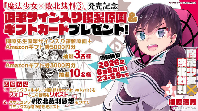 キルタイムコミュニケーションは、ヴァルキリーコミックス『魔法少女×敗北裁判3』の発売を記念して、柳原満月先生直筆サイン入り複製原画やAmazonギフト券が当たるプレゼントキャンペーンを開催いたします。