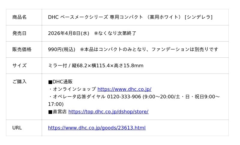 株式会社ディーエイチシー(本社:東京都港区、代表取締役社長:宮崎緑、以下:DHC)は、“Dreaming(夢見る心)”をテーマに、ディズニーの大人気プリンセス<シンデレラ>の世界観を取り入れた「DHC ベースメークシリーズ 専用コンパクト (薬用ホワイト) [シンデレラ]」を2026年4月8日(水)より、数量限定で発売いたします。