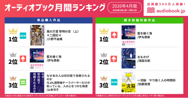 株式会社オトバンク( 本社:東京都文京区、代表取締役社長:久保田裕也、以下「オトバンク」)は、当社が運営する会員数300万人超、オーディオブック書籍ラインナップ数No.1(※1)のオーディオブック配信サービス「audiobook.jp」における、オーディオブック月間ランキング4月付(2026/3/1~3/31)を発表します。