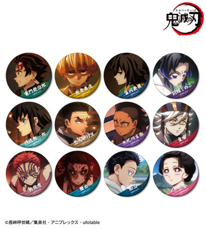 竈門炭治郎、我妻善逸、冨岡義勇、胡蝶しのぶ、時透無一郎、悲鳴嶼行冥、不死川玄弥、童磨、猗窩座、獪岳、狛治、恋雪の印象的なシーンをマットな手触りの缶バッジに仕上げました。