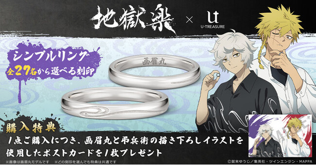 このたびの新作は、TVアニメ『地獄楽』とコラボレーションしたリング(指輪)です。内側の刻印は全27名の中からお選びいただけます。購入特典として描き下ろしイラストを使用したポストカードをプレゼントします。