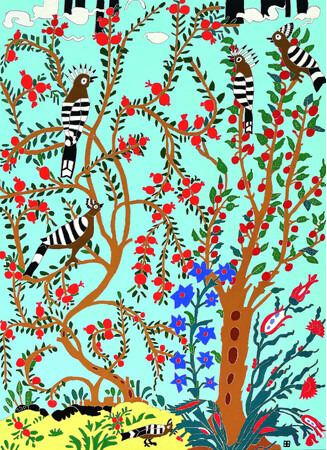 田中の作品は、直線ではなく曲線を重ねる独自の表現により、動物や植物の躍動感を書き出している点が特徴です。また、細部まで色を塗り分ける点も特徴であり、古代の織物などをモチーフにした絵画を描きます。