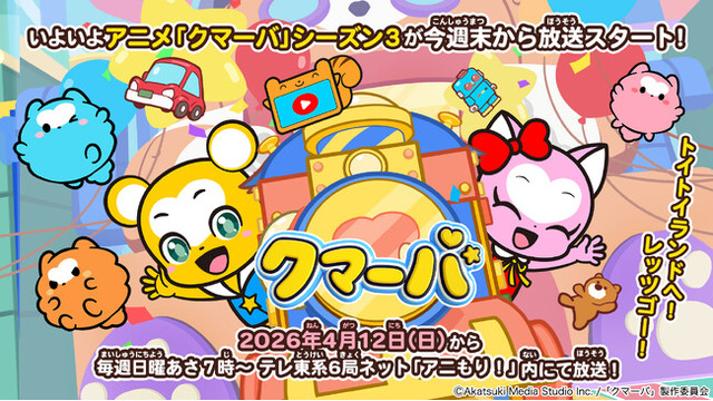 株式会社アカツキメディアスタジオ(本社:東京都品川区、代表取締役社長:樋渡昇一郎、株式会社アカツキの子会社)より、TVアニメ「クマーバ」シーズン3が、2026年4月12日(日)毎週日曜あさ7時~から、テレ東系6局ネット「アニもり!」内にて放送を開始することをお知らせします。
