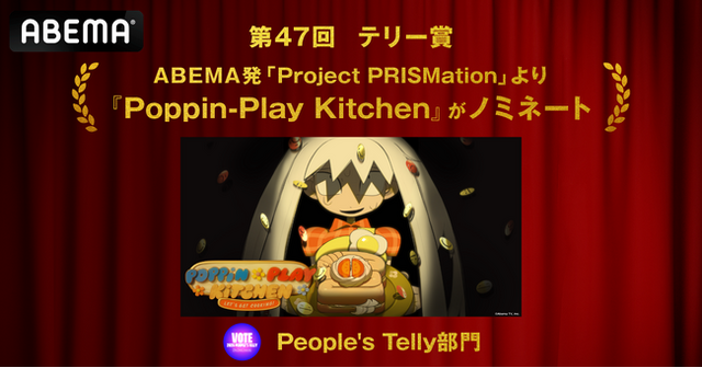 新しい未来のテレビ「ABEMA(アベマ)」は、次世代アニメクリエイターとともにオリジナルアニメ作品の創出を目指すプロジェクト「Project PRISMation(プロジェクト プリズメーション)」において、第1弾として公開したオリジナルアニメのパイロットフィルム『Poppin-Play Kitchen』(原案・監督・脚本・制作:Zemyata)が、国際的な映像広告賞『第47回テリー賞 People's Telly部門』にノミネートされたことをお知らせいたします。