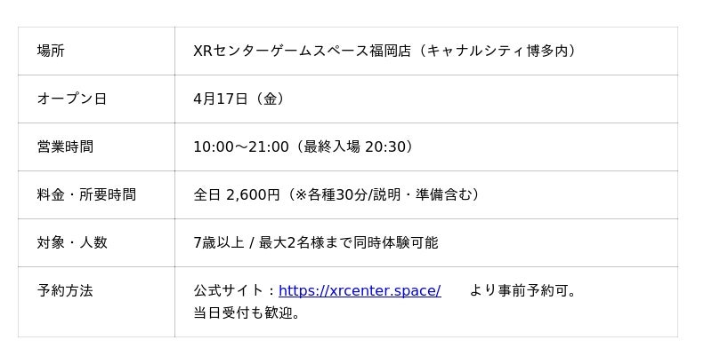 株式会社日本XRセンター(本社:東京都中野区、代表取締役CEO/プロデューサー:小林大河)は、直営店舗「XRセンターゲームスペース福岡店」(キャナルシティ博多内)にて、「一歩も動かずに圧倒的な非日常を味わえる」新しい着座型VRアトラクションを2026年4月17日(金)より導入いたします。