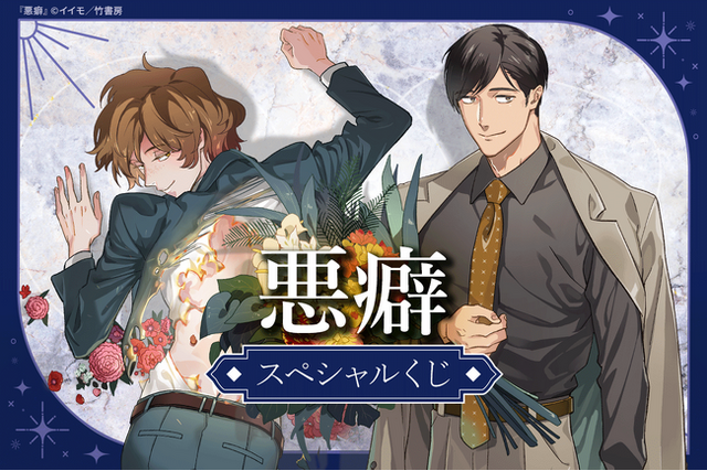 イイモ先生による大人気BL作品『悪癖』のスペシャルくじが登場!本くじのために描きおろされた美麗イラストをはじめ、コミックスの表紙イラストなどを使用した豪華なオリジナルグッズが多数ラインナップされています。販売期間: 2026年4月10日(金) ~ 2026年5月25日(月)まで