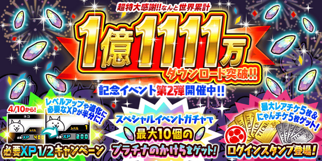 ポノス株式会社(本社:京都府京都市、代表取締役:辻子依旦、以下「ポノス」)が提供するスマートフォン向けゲームアプリ『にゃんこ大戦争』がシリーズ累計1億1111万ダウンロードを突破いたしました。これを記念して、期間限定記念イベント第2弾を2026年4月10日(金)11:00から開始いたしました。
