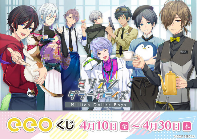 イケメン店員育成×恋愛ゲーム『ミリオンダラーボーイズ』(略称:『ミリダラズ』)より、オンラインくじ「eeoくじ」が登場! 2026年4月30日(木)まで、通販サイト「eeo Store online」にて期間限定で販売中です。
