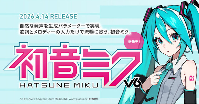 クリプトン・フューチャー・メディア株式会社(本社:北海道札幌市、代表取締役:伊藤博之、以下クリプトン)は、歌声合成ソフトウェア『初音ミク V6』を、2026年4月14日(火)にリリースいたしました。本製品は、ボーカルエディター「VOCALOID6 Editor」を同梱した〈スターターパック〉と、すでにエディターをお持ちの方に向けた〈ボイスバンク〉の2形態で展開。いずれの形態も歌唱パート以外の音楽制作に必要なソフトウェアや音源を同梱しているため、購入したすぐその日から本格的な音楽制作を始めることが可能です。