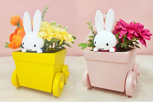 くるまがモチーフのイエローとピンクのプランターです。後ろにお花を入れると、ひょっこりと顔を出すミッフィーが花車で運ばれているように見えます。リビングの棚やデスクなど、どの空間にも馴染みやすい両手に収まるサイズです。お花を飾ったあとは、小物入れとしてもご使用いただけます。
