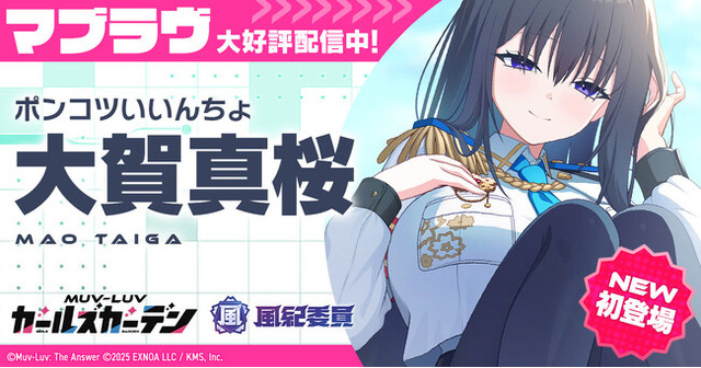 合同会社EXNOA(本社:東京都港区、CEO:東條 寛、URL:https://games.dmm.com/)と株式会社KMS(本社:東京都品川区、代表:梶原 健太郎、URL:http://kms3.com/)が贈るマブラヴ最新作『マブラヴ ガールズガーデン』(以下、マブガル)が、風紀委員の新イベント「巡回日和」後半を開始し、新SSR「大賀 真桜」が登場したことをお知らせいたします。