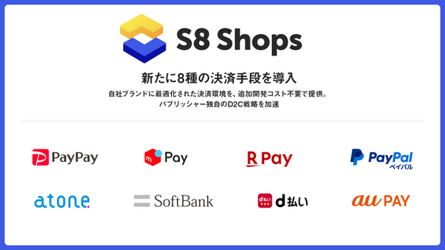 「S8 Shops」は、パブリッシャー様が自社ブランドのWebショップを独自ドメインで構築・運用するためのエンタープライズソリューションです。今回の決済拡充により、クレジットカードを保有しない若年層をはじめ、幅広いユーザー層の取り込みが可能となります。多様な支払い選択肢を提供することで決済離脱(カゴ落ち)を低減し、パブリッシャー様のD2C戦略における売上機会の最大化を強力にバックアップします。