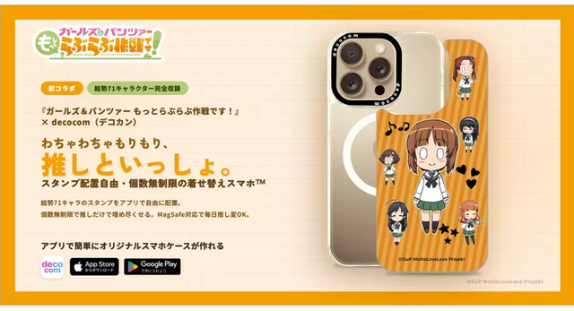 株式会社デコレーションカンパニーは、劇場アニメーション『ガールズ&パンツァー もっとらぶらぶ作戦です!』と初コラボし、公式キャラ71名を収録したカスタムスマホケースをdecocomアプリで販売開始。スタンプは配置自由・個数無制限で独自デザインが作成可能。MagSafe対応「着せ替えスマホ(TM)」により、デザインの差し替えも簡単で、推しと日常を楽しめる新たなファン向けアイテムを提案します。