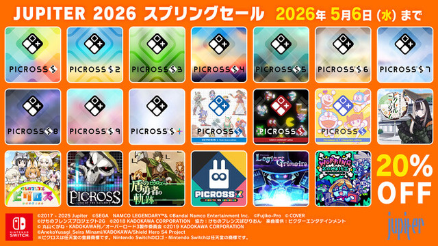 2026年4月16日より、「ピクロス(TM)S KONAMI ANTIQUES edition」の製品版(ダウンロード専用)の予約受付を開始するとともに、ジュピターのNintendo Switchダウンロード専用ソフト中から、20タイトルを対象にセールを実施します。