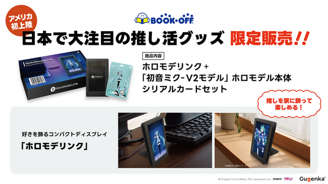 本商品は、スマートフォンで楽しめるデジタルフィギュア「ホロモデル」の『初音ミク』シリアルカードと専用デバイス「ホロモデリンク」をセットにした商品を、BOOKOFF U.S.A. INC.が展開する米国店舗にて販売開始いたします。