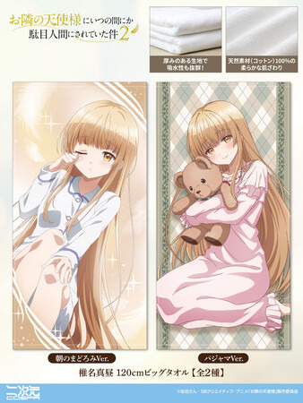 TVアニメ『お隣の天使様にいつの間にか駄目人間にされていた件』より、椎名真昼の可愛い姿を堪能できる「120cmビッグタオル」朝のまどろみVer.、パジャマVer.の2種類が二次元コスパから新たに登場いたします。
