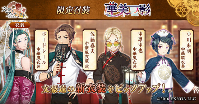 文豪の「衣装」や、会派に装備する事で能力を強化できる「装像」などが入手できるコンテンツ「召装」に、限定召装『華美ノ影』が期間限定で登場します。この召装では、「ボードレール」「佐藤春夫」「中原中也」「小川未明」の新衣装〈中華風衣装〉を一定の確率で入手できます。
