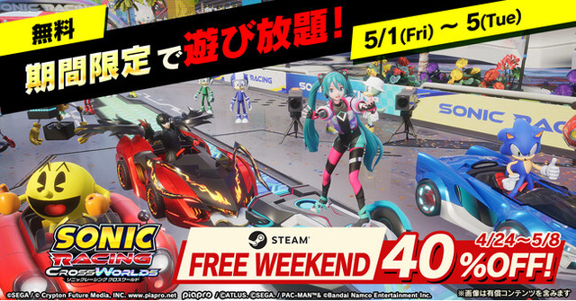 5月1日(金)から5月5日(火)まで、PC(Steam)にて、『ソニックレーシング クロスワールド』製品版の全機能を無料でお楽しみいただけます。無料期間中に作成したセーブデータは、後日製品版を購入した際にそのまま引き継いでプレイを続行することが可能です。ぜひこの機会に、「クロスワールド」のレースを無料でご体験ください!