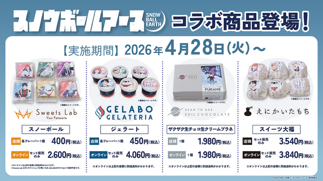 札幌市を拠点に様々なスイーツ事業を展開している「株式会社エンクル」(本社:[北海道札幌市]、代表取締役:[笹川円])は、2026年4月3日より毎週金曜日23:30放送開始のTVアニメ「スノウボールアース」とのコラボ商品を期間限定で販売開始いたします。