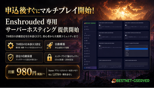 ・サービスサイト:https://gss.bestnetllc.co.jp/server/enshrouded/・サーバー設定 完全ガイド(全 78 項目):https://gss.bestnetllc.co.jp/docs/enshrouded-サーバー設定-完全ガイド/