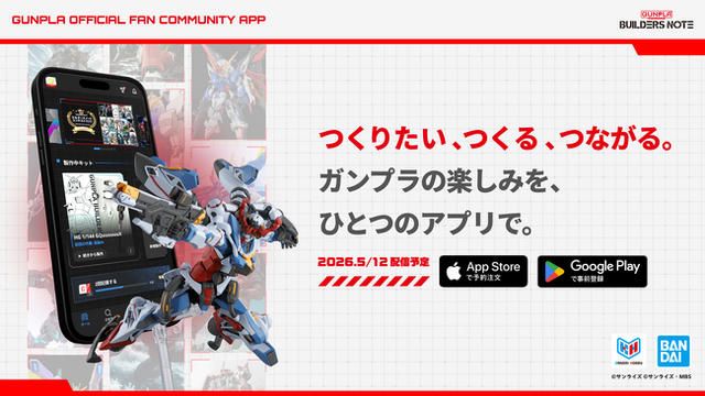 ガンプラ公式ファンコミュニティ「ビルダーズノート(BUILDERS NOTE)」は、ガンダムのプラモデル(以下、ガンプラ)における「手に入れる → 作る → つながる」という一連の楽しみを、ひとつの場で支えることを目指した、アプリ「ビルダーズノート(BUILDERS NOTE)」の事前登録を、App StoreおよびGoogle Playにて開始しました。正式リリースは2026年5月12日の予定です。