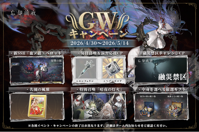 狂魔界域の覚醒体「血ノ鎖・ヘロット」の登場にあわせて新覚醒体イベントを開催するとともに、ゴールデンウィーク期間にあわせた各種キャンペーンや、お好きな常設覚醒体・常設運命の札を選べる特別な厳選ギフトの販売も行います。