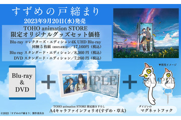 新海誠監督の最新作『すずめの戸締まり』のBlu-ray・DVDが、9月20日に発売を迎える。アニメーションレーベル「TOHO animation」の公式通販サイト「TOHO animation STORE(以下「TaS」」では、限定オリジナルグッズをセットにした特別仕様にて予約受付中だ。